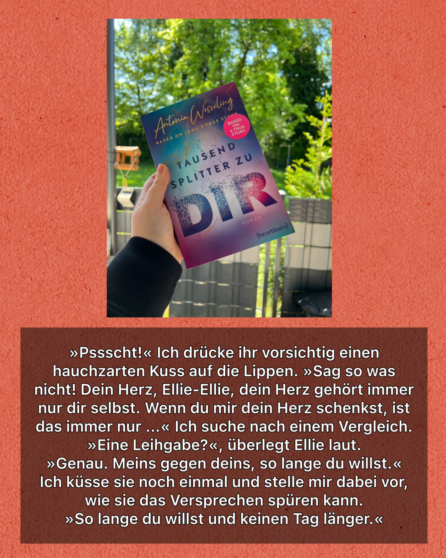 • Mit Abstand „Tausend Splitter zu dir“ von Antonia Wesseling. Beachtet bei diesem Buch bitte unbedingt die Triggerwarnung bzw. die Content-Warnung am Anfang vom Buch. Es war wirklich heftig, aber zugleich auch sooo wunderschön. ![]()