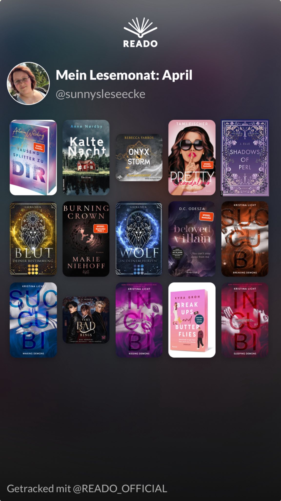 Es wurden insgesamt 15 Bücher. Davon 2 Hörbücher. 4 Prints. Und 9 EBooks.