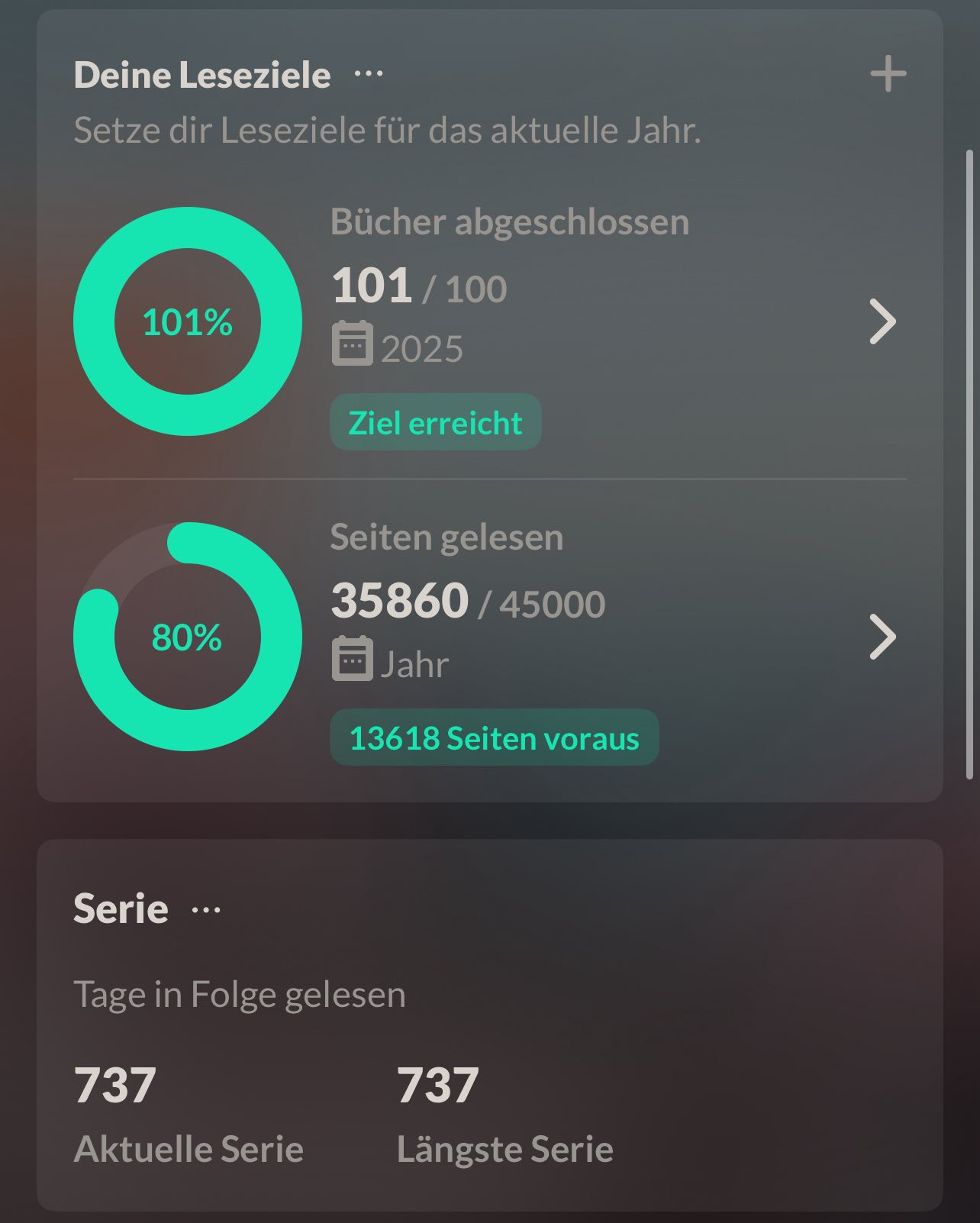 Ich komme damit auf 5882 gelesene Seiten und 2899 gehörte Minuten.