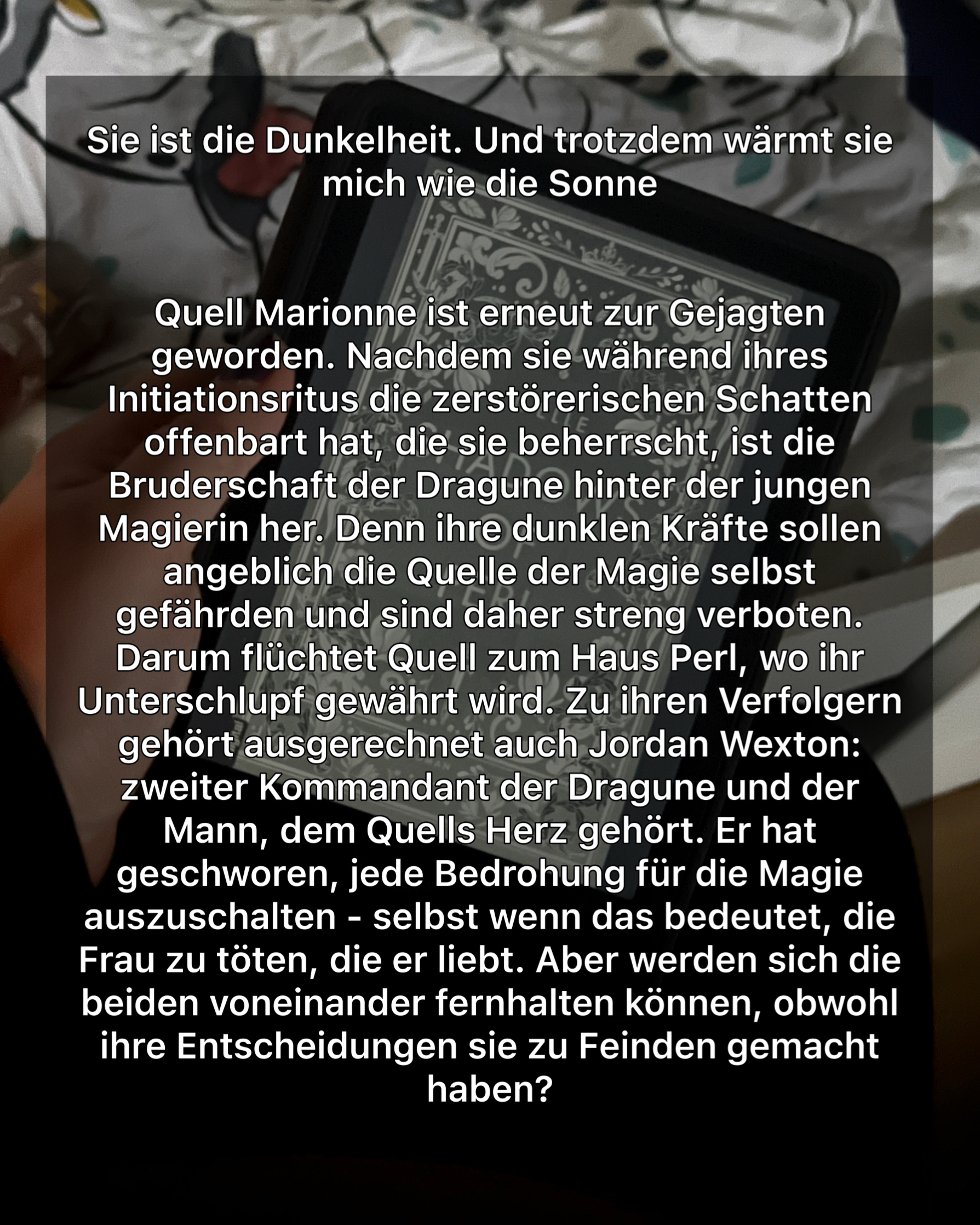 Quell Marionne ist erneut zur Gejagten geworden. Nachdem sie während ihres Initiationsritus die zerstörerischen Schatten offenbart hat, die sie beherrscht, ist die Bruderschaft der Dragune hinter der jungen Magierin her. Denn ihre dunklen Kräfte sollen angeblich die Quelle der Magie selbst gefährden und sind daher streng verboten. Darum flüchtet Quell zum Haus Perl, wo ihr Unterschlupf gewährt wird. Zu ihren Verfolgern gehört ausgerechnet auch Jordan Wexton: zweiter Kommandant der Dragune und der Mann, dem Quells Herz gehört. Er hat geschworen, jede Bedrohung für die Magie auszuschalten – selbst wenn das bedeutet, die Frau zu töten, die er liebt. Aber werden sich die beiden voneinander fernhalten können, obwohl ihre Entscheidungen sie zu Feinden gemacht haben?
